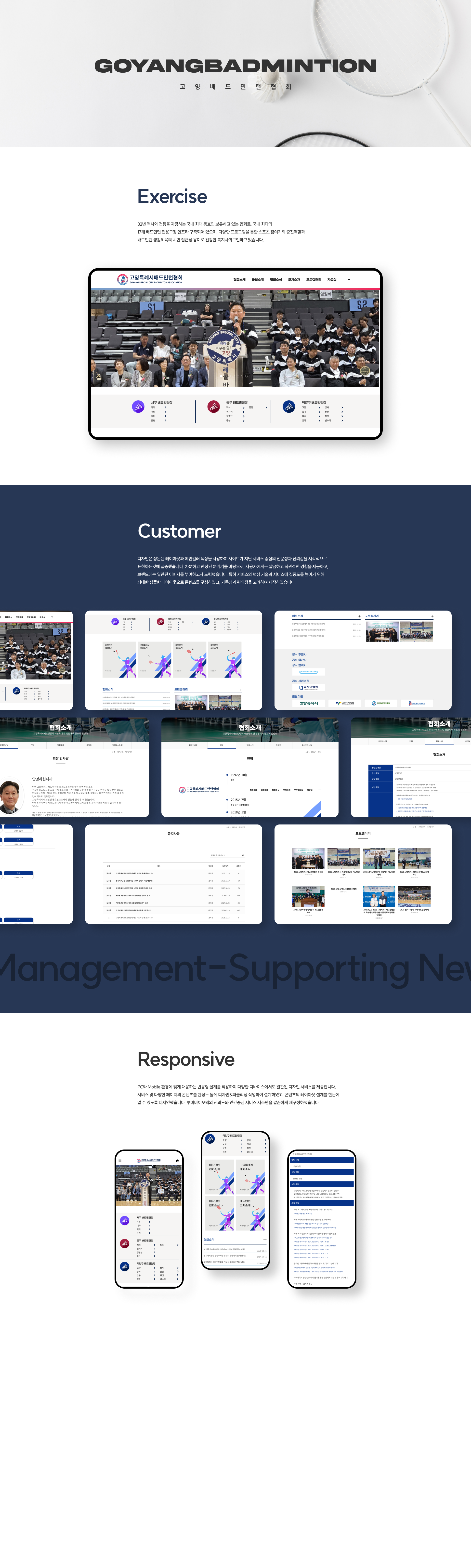 지역 배드민턴 커뮤니티를 위한 정보 제공과 소통을 중심으로 설계되었습니다. 전체적인 디자인은 깔끔하고 직관적인 레이아웃을 통해 사용자 친화적인 경험을 제공합니다. 주요 색상은 블루와 화이트 계열로 구성되어 있으며, 이는 신뢰성과 청결함을 시각적으로 표현하였습니다.