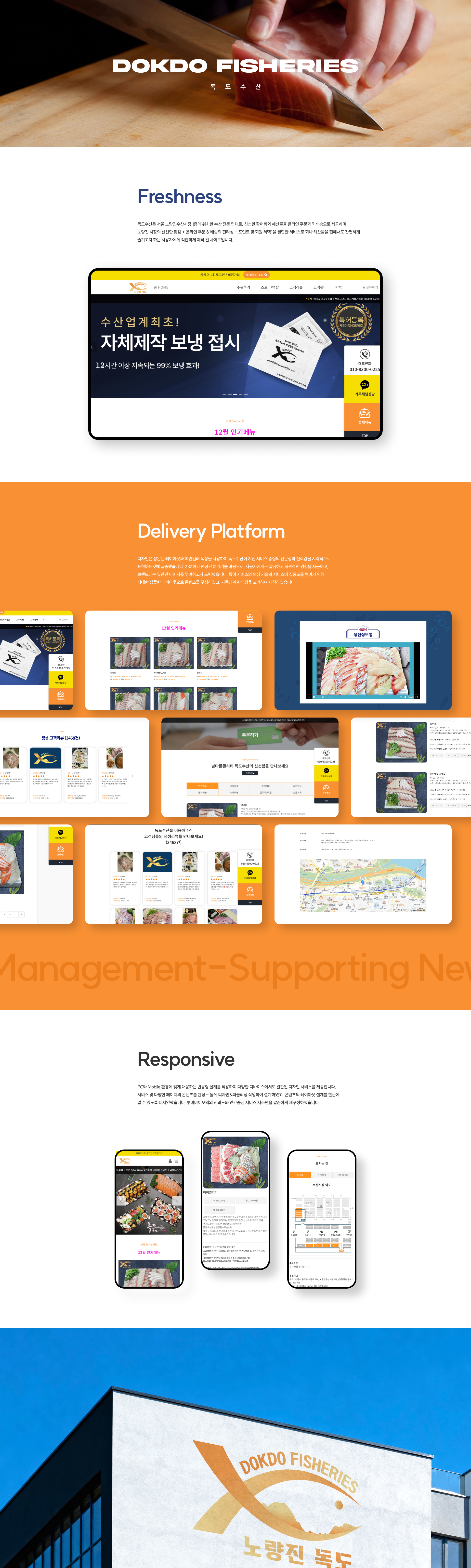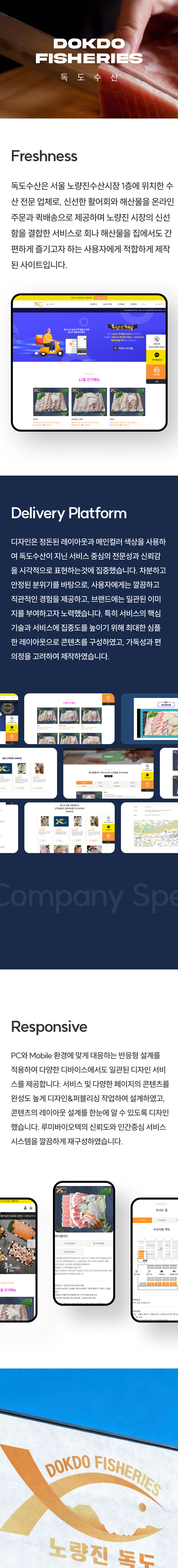 독도수산은 신선한 활어회와 고급 수산물을 강조하는 디자인으로 구성되어 있습니다. 주요 색상은 블루와 화이트 계열로 구성되어 있으며, 이는 신뢰성과 청결함을 시각적으로 표현합니다. 전체적인 레이아웃은 깔끔하고 직관적이며, 사용자 친화적인 경험을 제공합니다.