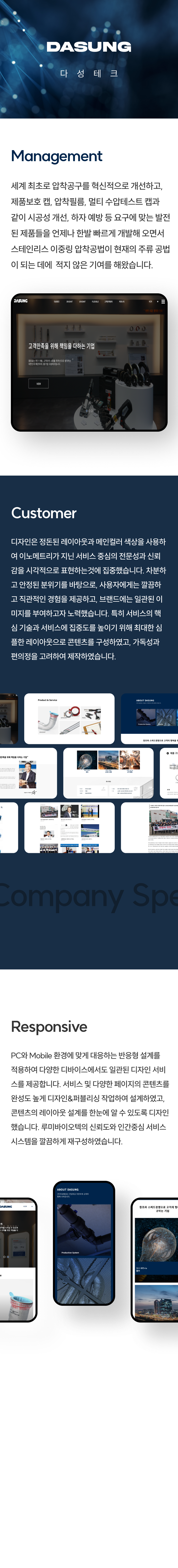 배관자재 전문 기업으로서의 기술력과 신뢰성을 강조하는 디자인 컨셉으로, 전체적인 레이아웃은 사용자 친화적으로 구성되어 있어 방문자들이 원하는 정보를 쉽게 찾을 수 있도록 하였고, 주요 메뉴를 명확하게 배치하여 사용자가 필요한 정보를 빠르게 찾을 수 있도록 구성하였습니다.