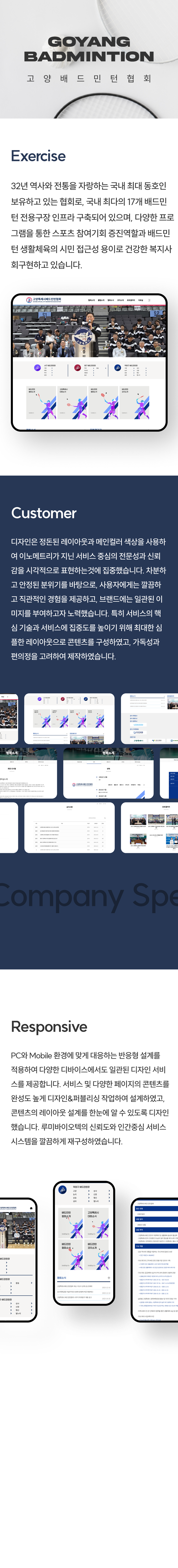 지역 배드민턴 커뮤니티를 위한 정보 제공과 소통을 중심으로 설계되었습니다. 전체적인 디자인은 깔끔하고 직관적인 레이아웃을 통해 사용자 친화적인 경험을 제공합니다. 주요 색상은 블루와 화이트 계열로 구성되어 있으며, 이는 신뢰성과 청결함을 시각적으로 표현하였습니다.