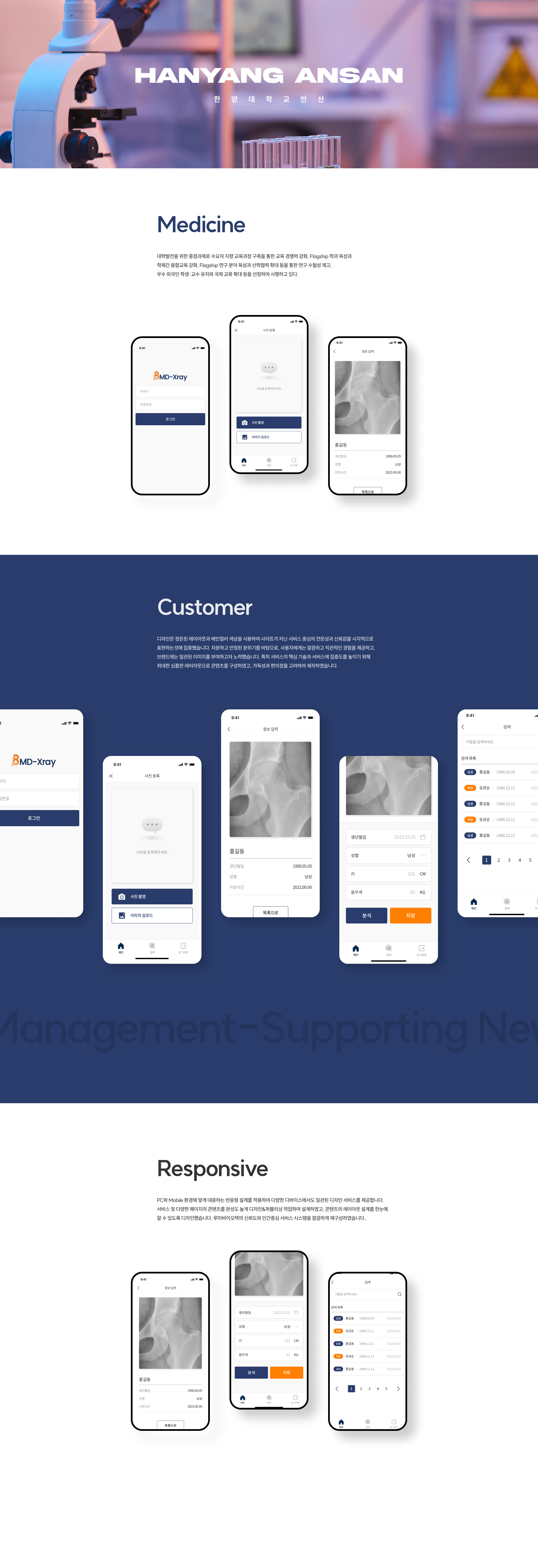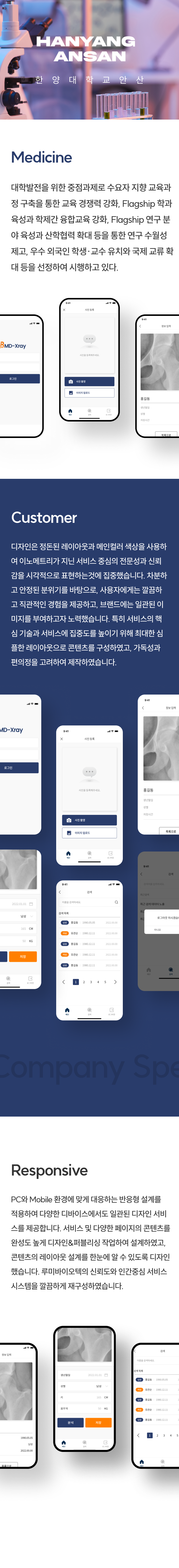 메인 이미지에 간략한 텍스트 레이아웃을 적절하게 사용하여 사용자가 필요한 정보를 쉽게 찾을 수 있도록 구성하였고, 전문성과 신뢰성을 강조하는 색상을 사용하였습니다.